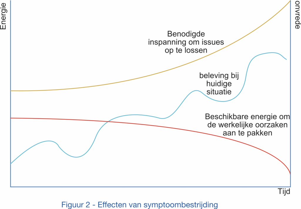 Ontwikkelingen die buiten de bestaande context vallen, leiden tot symptoombestrijding. Dit biedt tijdelijk lucht, maar de oorzaken blijven bestaan. Uiteindelijk ontstaat er een crisis die heroriëntatie afdwingt.