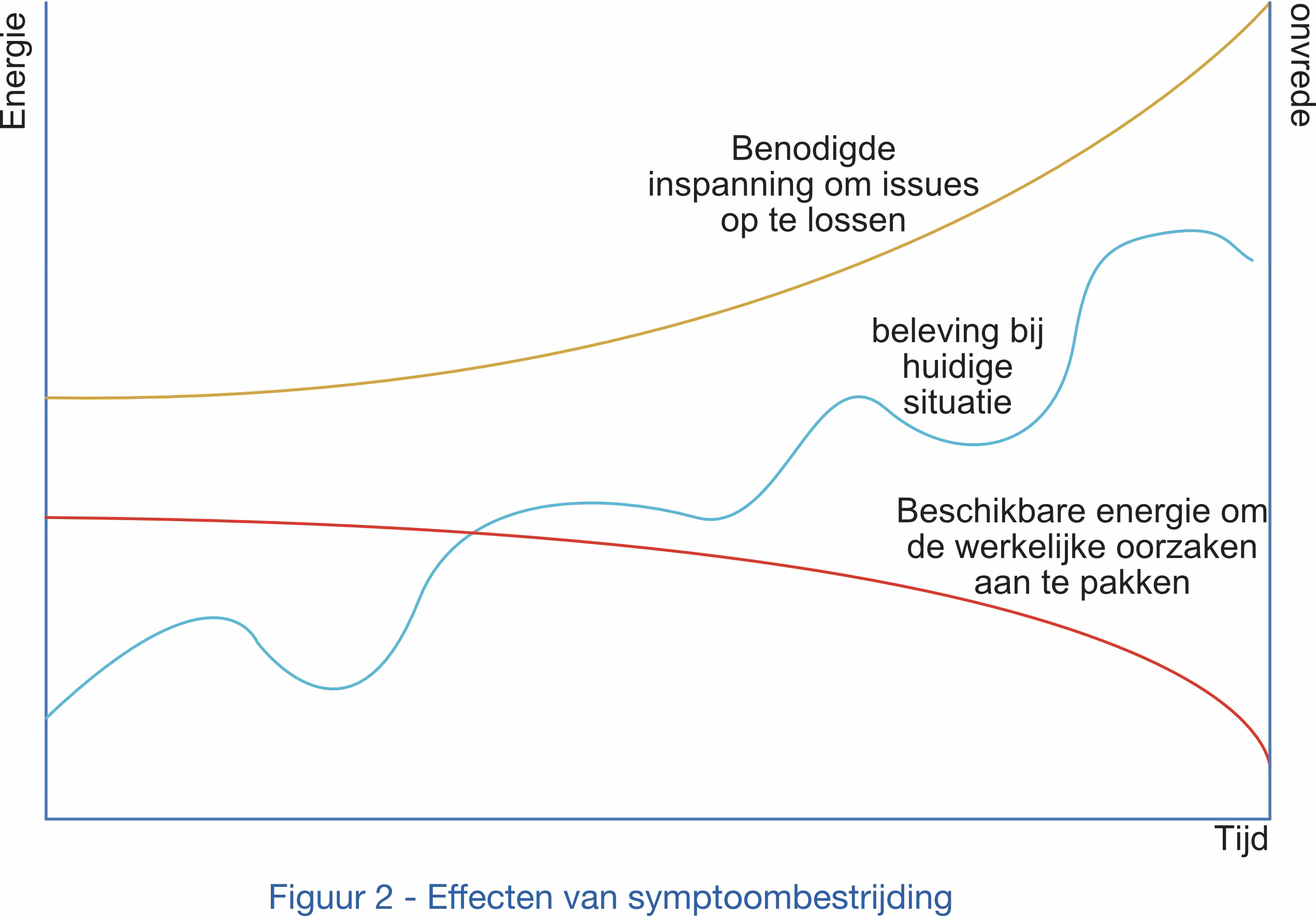 Figuur 2 toont hoe de prestaties van een organisatie zich ontwikkelen in de loop der tijd, onder invloed van deze twee krachten. Organisaties die hun eigen ontwikkeling niet beheersen, verliezen uiteindelijk hun maatschappelijke en economische relevantie.
